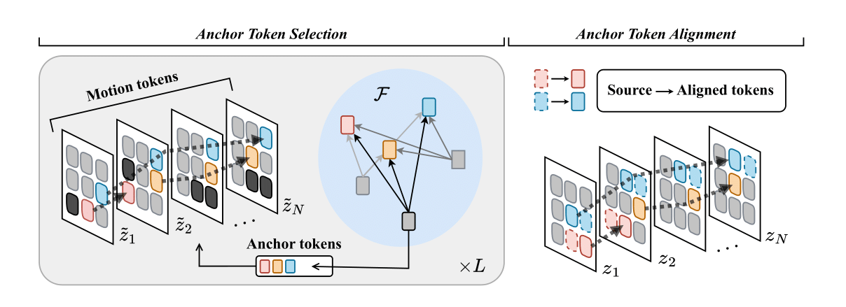 First, we define motion tokens, which are a set of extracted features using a video diffusion model. In contrast to prior works (Geyer et al. 2024; Wang et al. 2024a), where features (often referred to as “tokens") are independently extracted from each latent pixel in every frame, we track those tokens across frames and obtain distinct motion trajectories to extract more representative features of motion dynamics. From this set, we select a subset of anchor tokens that represent the most informative motion patterns in the video. Each anchor token captures a distinct local motion, and together they form a comprehensive summary of the overall motion dynamics.
